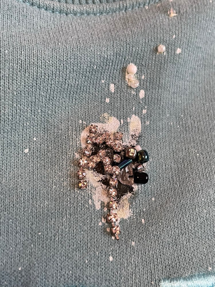 Hand-painted and embellished pigeon droppings, embroidered with beads and rhinestones.