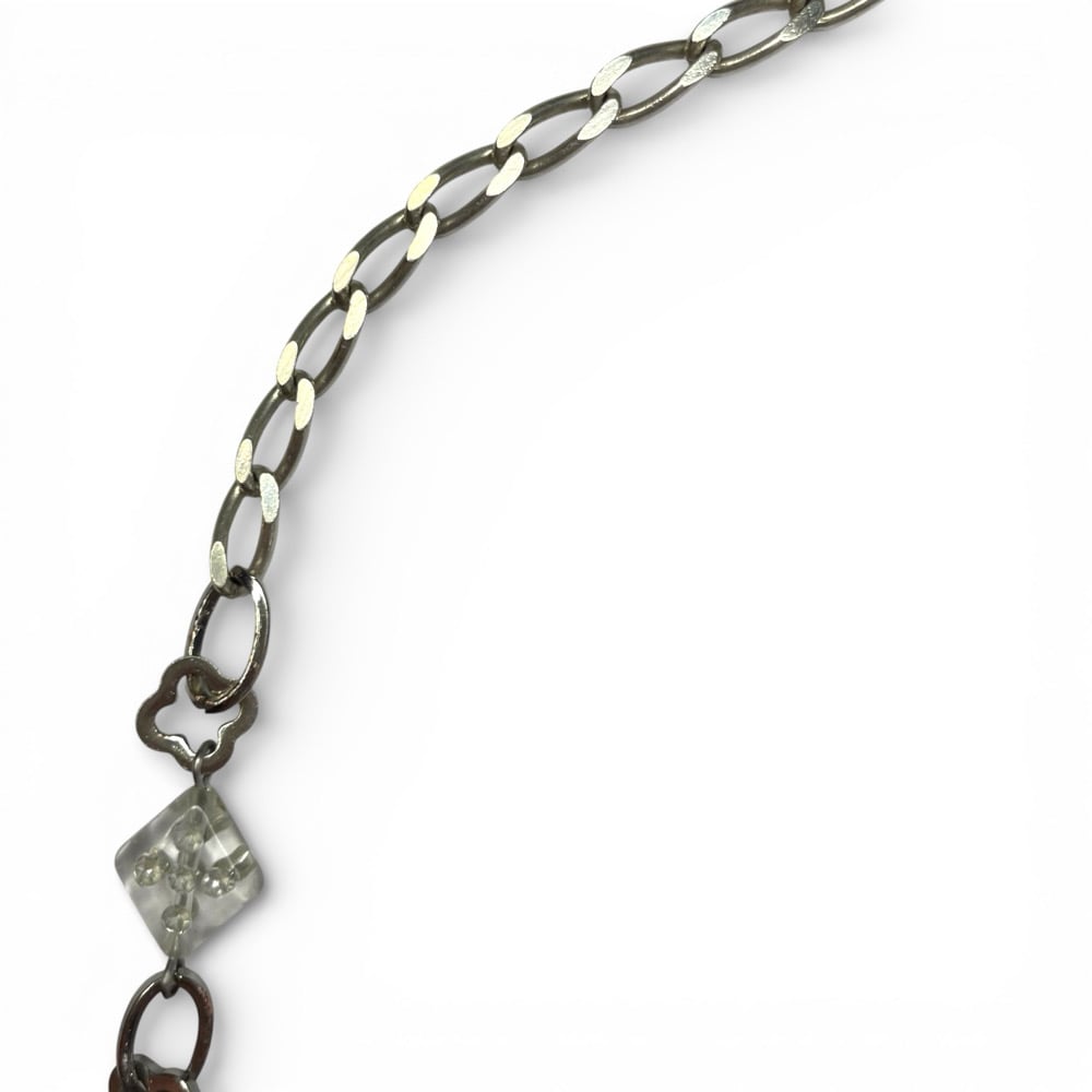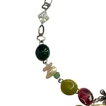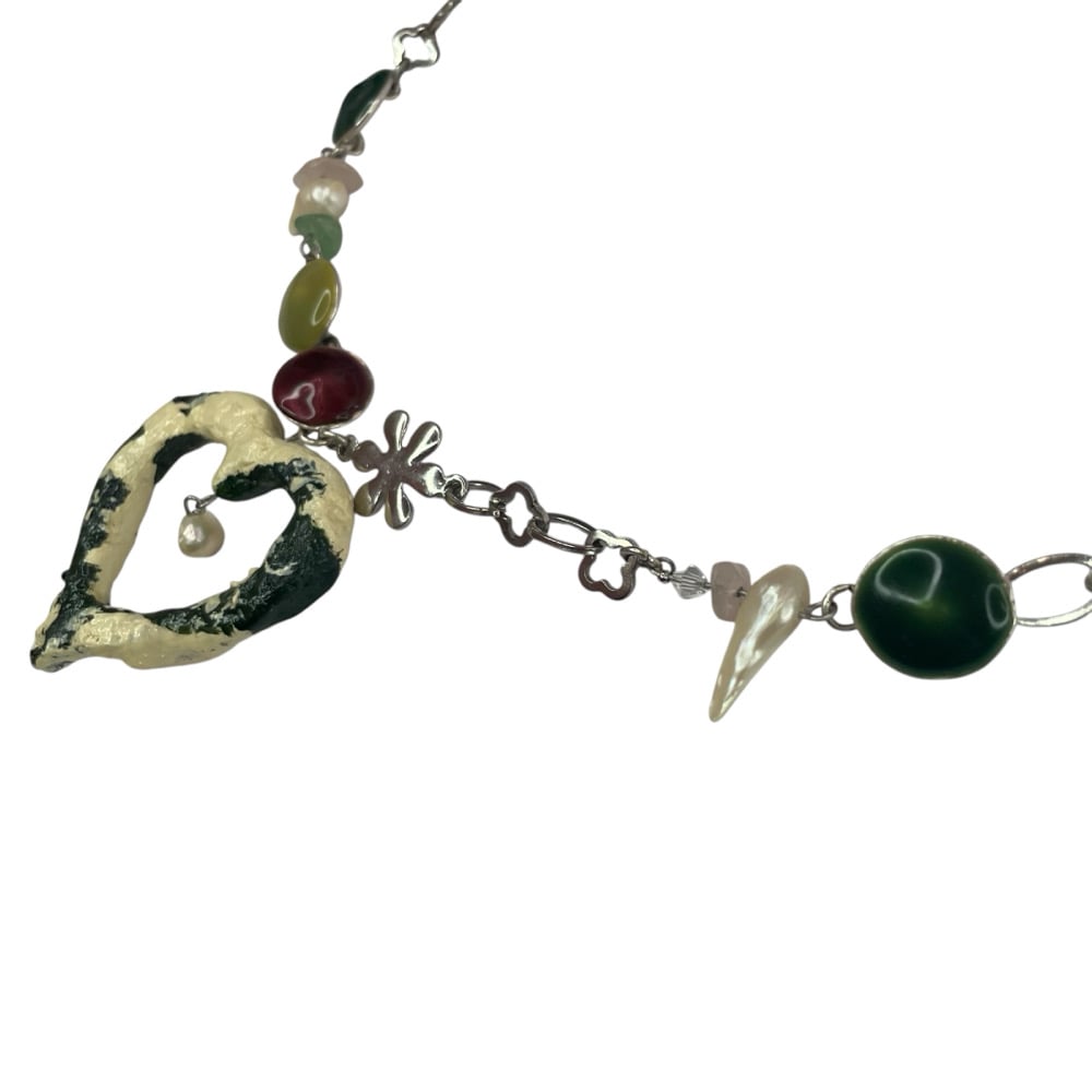 The piece features natural mineral stones and pearls, with dominant green and pink tones, evoking living love, growth, and tenderness.